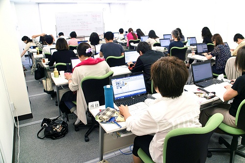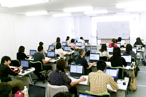 1人1台のPCとプロジェクターを使って実習します。受講生が15人以上の場合は、講師のほかに補助者がつきます。