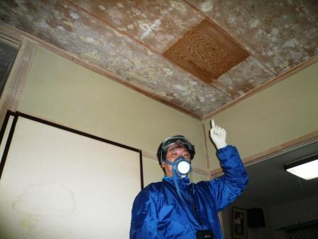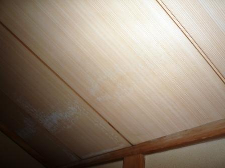 雨漏りが原因で和室天井に発生したカビです。 かなり広範囲に渡って発生し、和室天井裏にも大きな 雨染みが出来ていました。 カビは止められますが、まず雨漏りの補修をしてもらい たいものです。