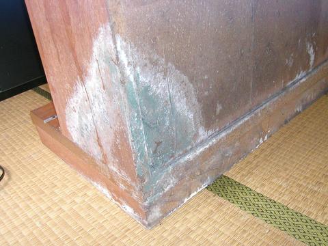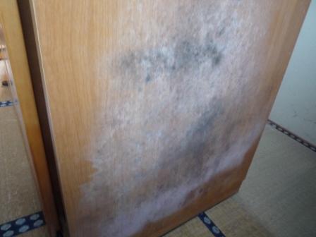 結露が激しい壁にピッタリと付けてカビた家具。 色素は多少残りますが、カビはしっかり止める事が出来ます。 家具をたまには動かしていますか?