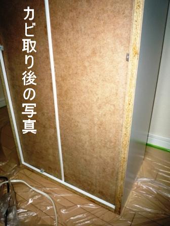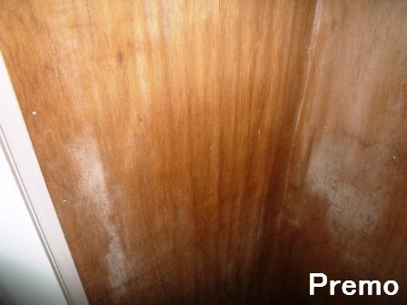間口半間の押入れのベニアに発生しているカビの写真です。 ベニア裏に発生する結露が原因でベニアにシワが出来ています。一般建築では、このベニアに重ね張りをしたり張替えを したりしますが、それではカビは再発します。 防カビ施工が必要な押入れです。